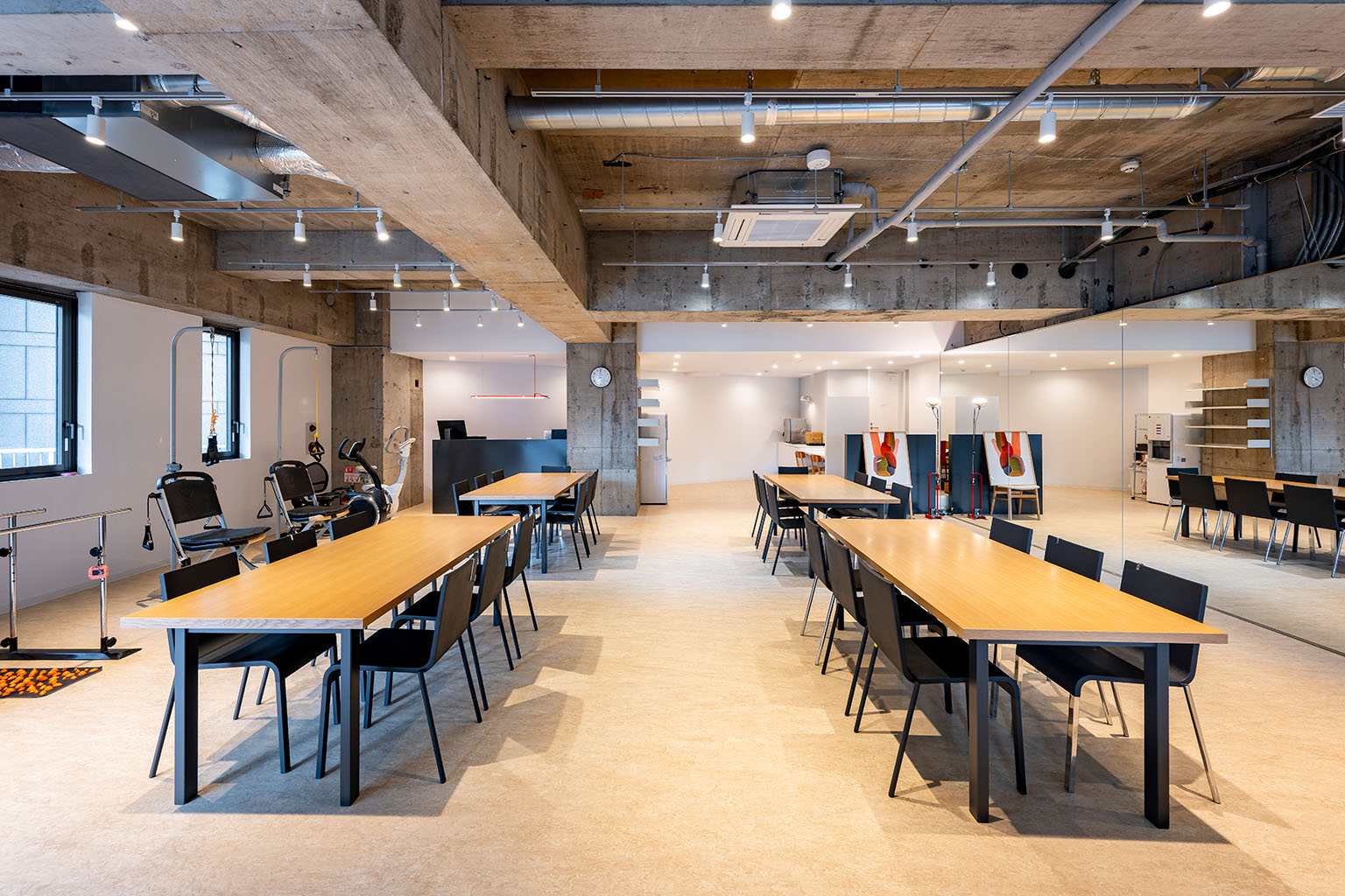 バリアフリー設計の館内には、リハビリ機器、リラクゼーションスペース、休憩スペースなどを完備。快適で安心して過ごせる環境を整えています。